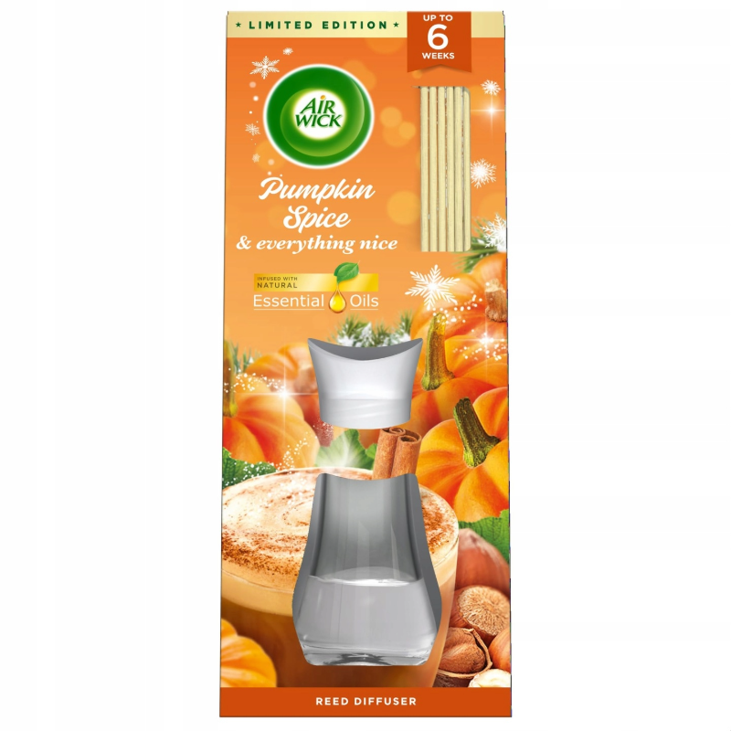 Doživite prijetno dišavno izkušnjo z Air Wick dišečimi palčkami Buča z začimbami. Vonj sočne buče, obogaten s toplimi začimbami, kot so cimet, medenjak in nageljnove žbice, napolni prostor s prijetno domačnostjo in jesensko vzdušje. Naravna eterična olja in eleganten dizajn stekleničke ustvarijo osvežilec zraka, ki diši in hkrati ustrezno dopolnjuje ambient.